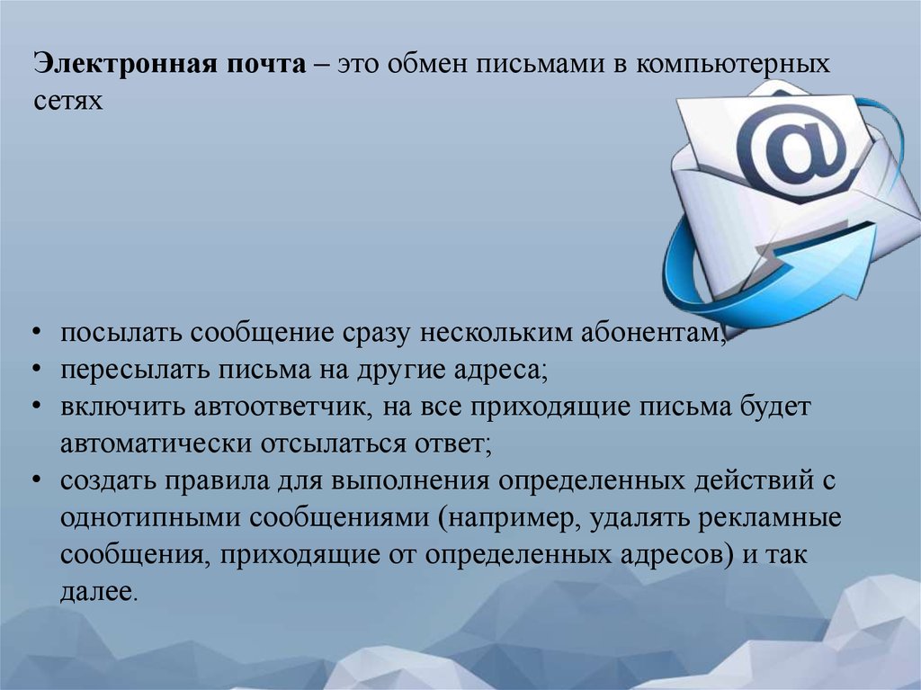 Электронная почта – это обмен письмами в компьютерныхсетях