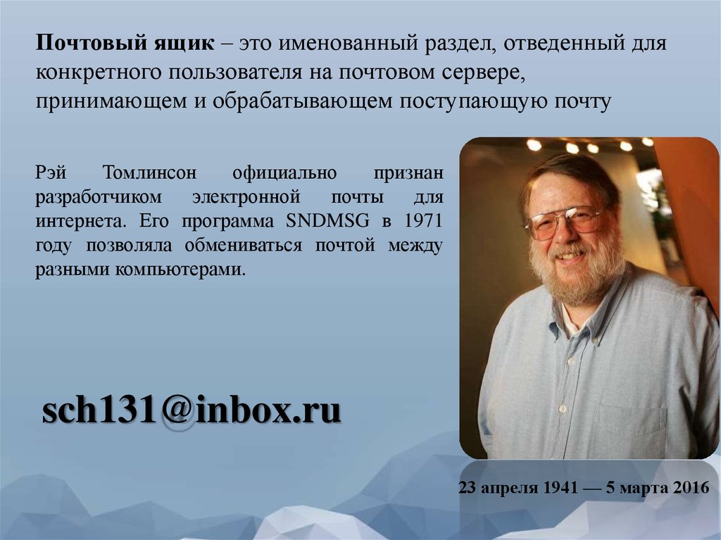 Почтовый ящик – это именованный раздел, отведенный дляконкретного пользователя на почтовом сервере,