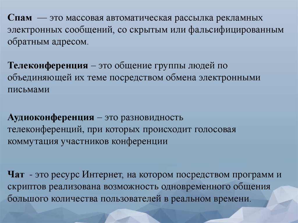 Спам — это массовая автоматическая рассылка рекламныхэлектронных сообщений, со скрытым или фальсифицированным
