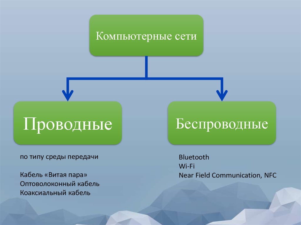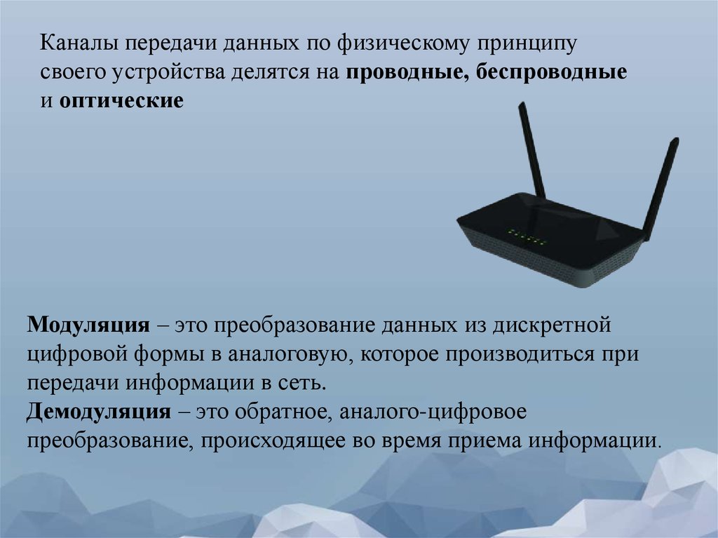 Каналы передачи данных по физическому принципусвоего устройства делятся на проводные, беспроводные