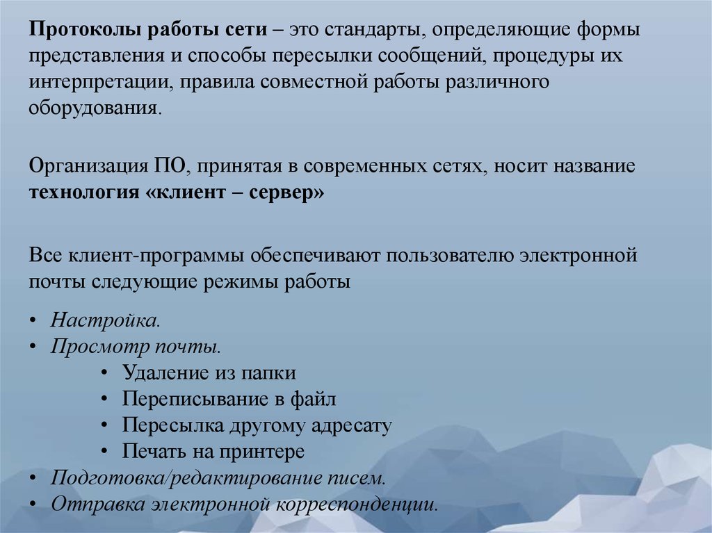 Протоколы работы сети – это стандарты, определяющие формыпредставления и способы пересылки сообщений, процедуры их