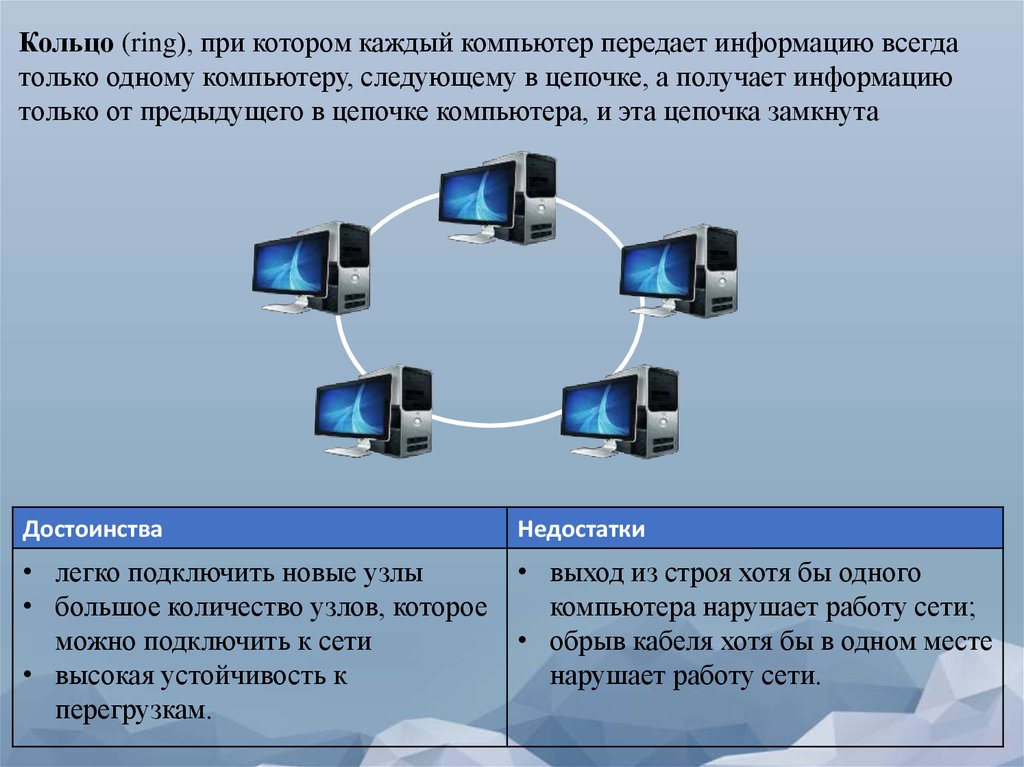 Кольцо (ring), при котором каждый компьютер передает информацию всегдатолько одному компьютеру, следующему в цепочке, а получает информацию