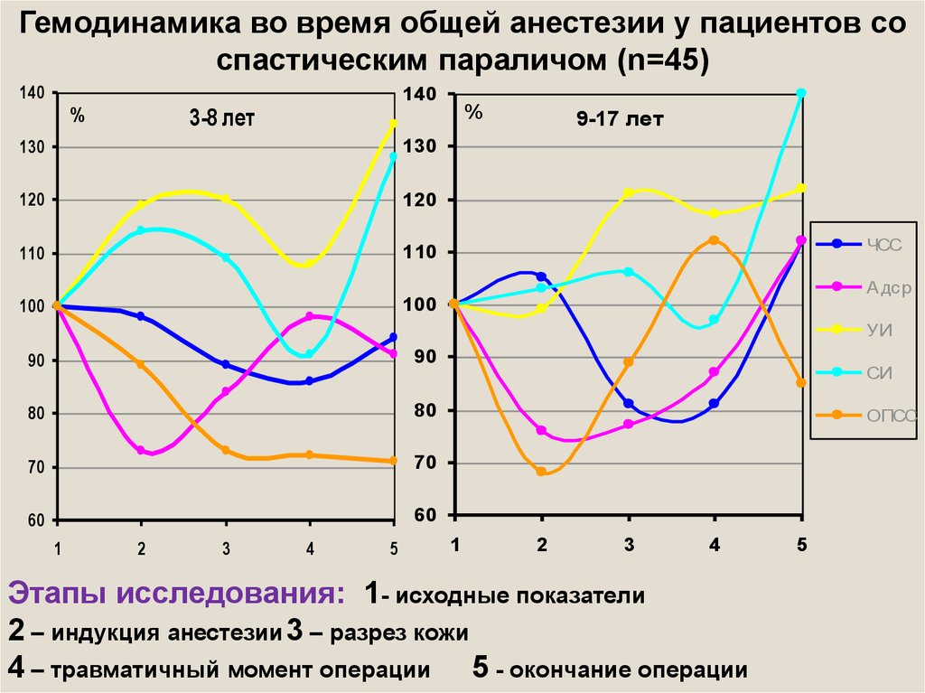 Гемодинамика во время общей анестезии у пациентов соспастическим параличом (n=45)