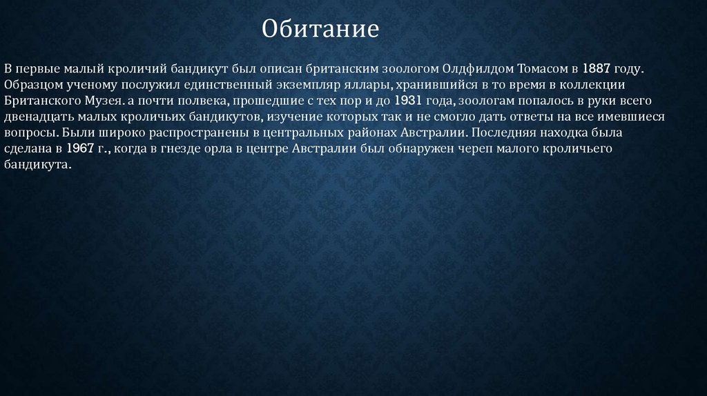 ОбитаниеВ первые малый кроличий бандикут был описан британским зоологом Олдфилдом Томасом в 1887 году.