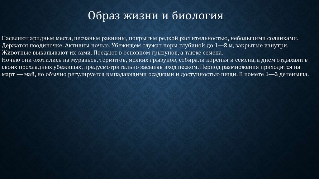 Образ жизни и биологияНаселяют аридные места, песчаные равнины, покрытые редкой растительностью, небольшими солянками.