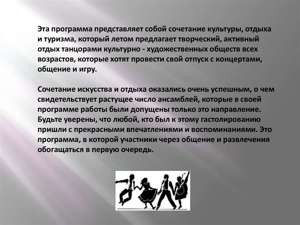 Эта программа представляет собой сочетание культуры, отдыхаи туризма, который летом предлагает творческий, активный