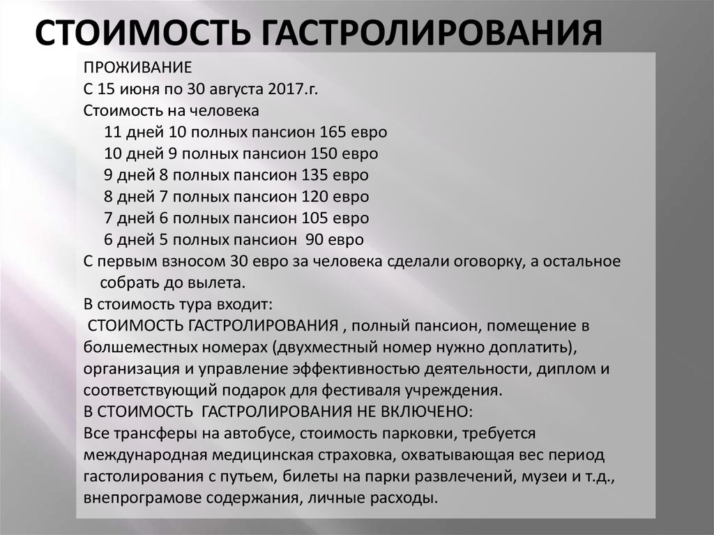 СТОИМОСТЬ ГАСТРОЛИРОВАНИЯПРОЖИВАНИЕ