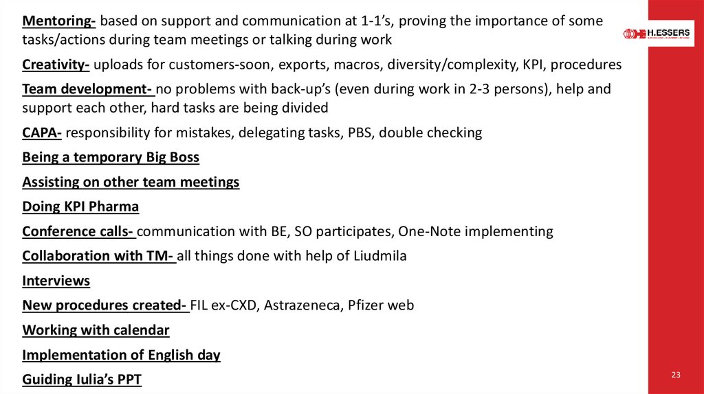 Mentoring- based on support and communication at 1-1’s, proving the importance of sometasks/actions during team meetings or talking during work