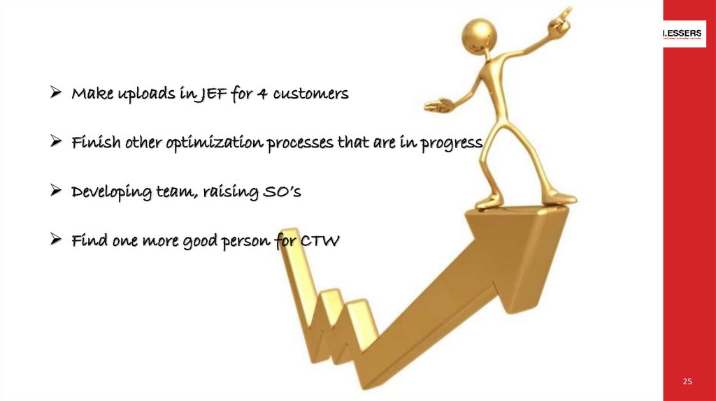 Make uploads in JEF for 4 customersFinish other optimization processes that are in progress