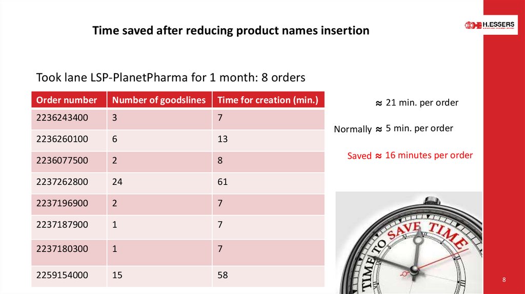 Time saved after reducing product names insertionTook lane LSP-PlanetPharma for 1 month: 8 orders
