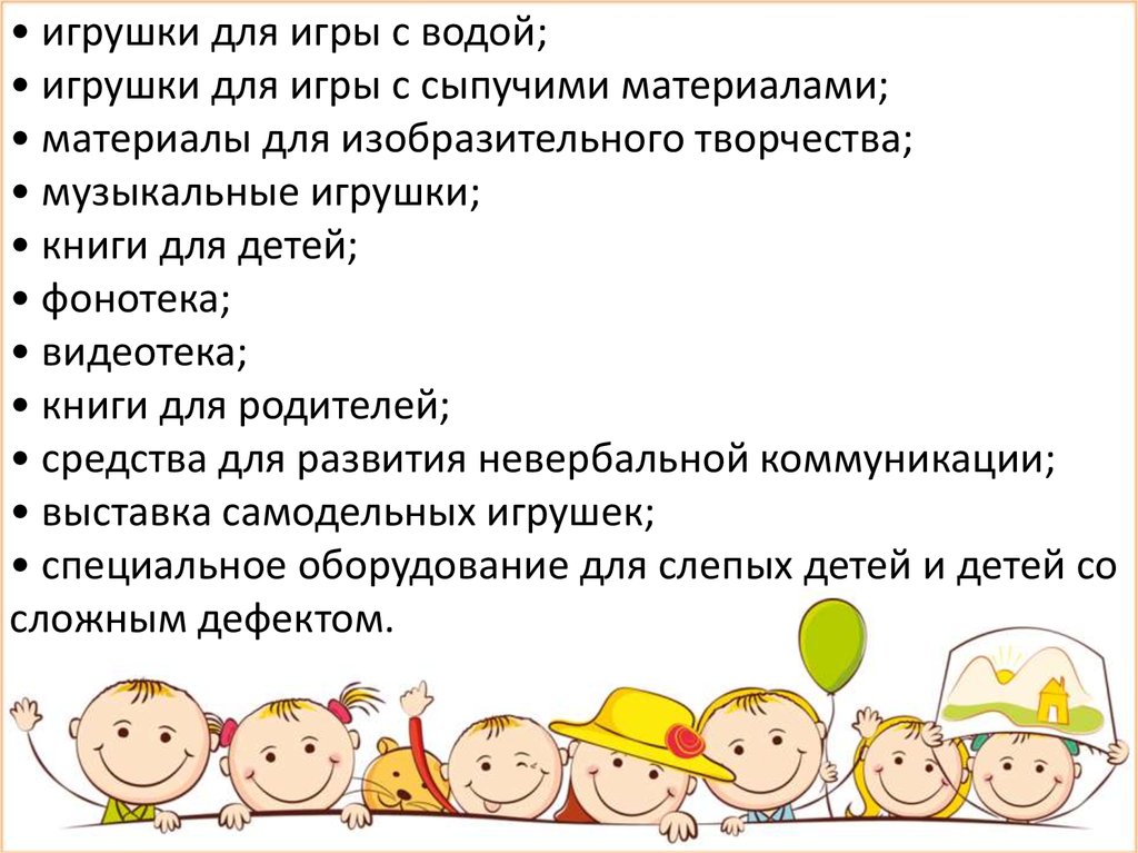 • игрушки для игры с водой;• игрушки для игры с сыпучими материалами;