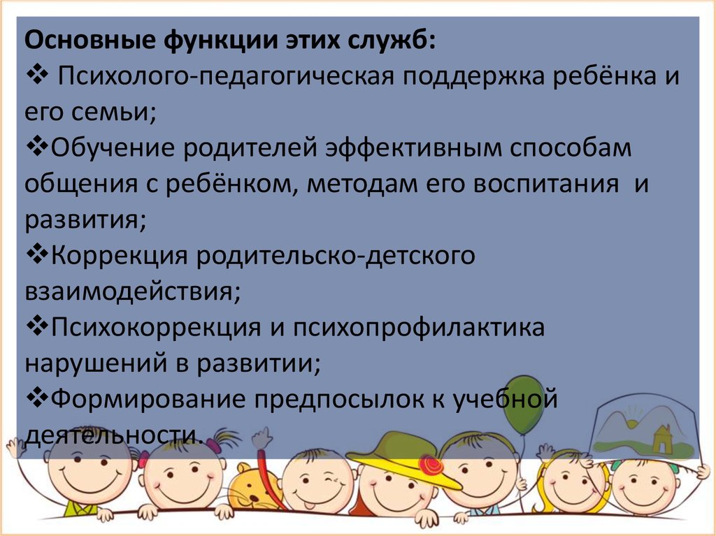 Основные функции этих служб:Психолого-педагогическая поддержка ребёнка и