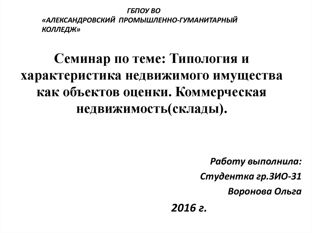 1. Семинар по теме: Типология и характеристика недвижимого имущества как объектов оценки. Коммерческая недвижимость(склады).
