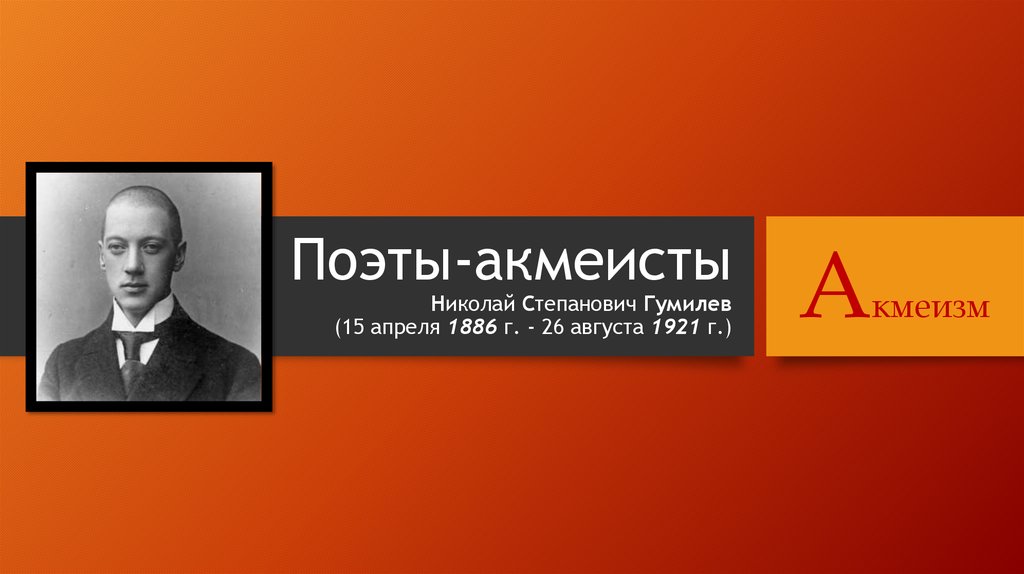 1. Поэты-акмеисты Николай Степанович Гумилев (15 апреля 1886 г. - 26 августа 1921 г.)