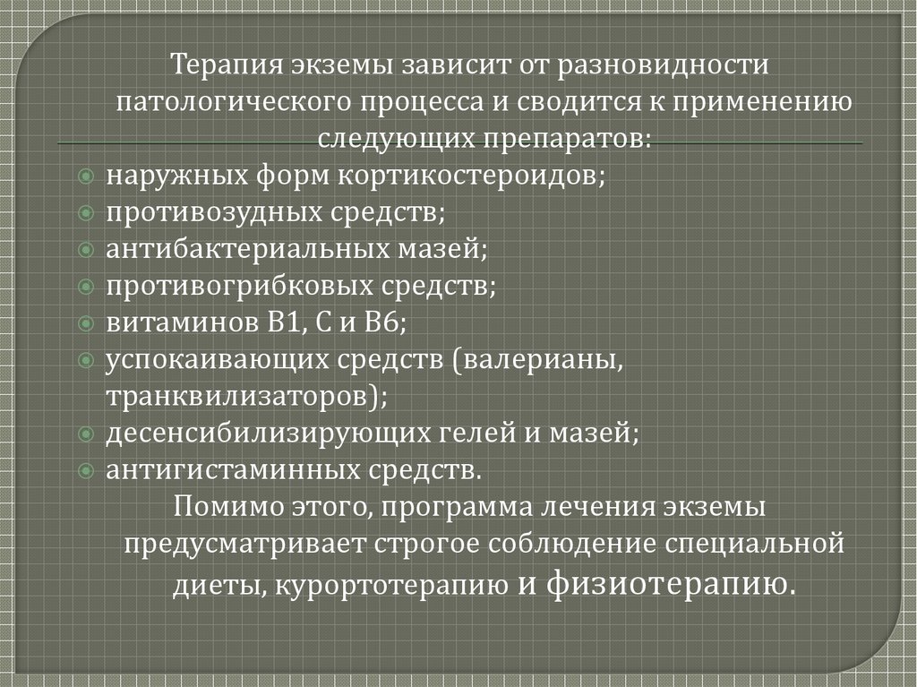 Терапия экземы зависит от разновидностипатологического процесса и сводится к применению