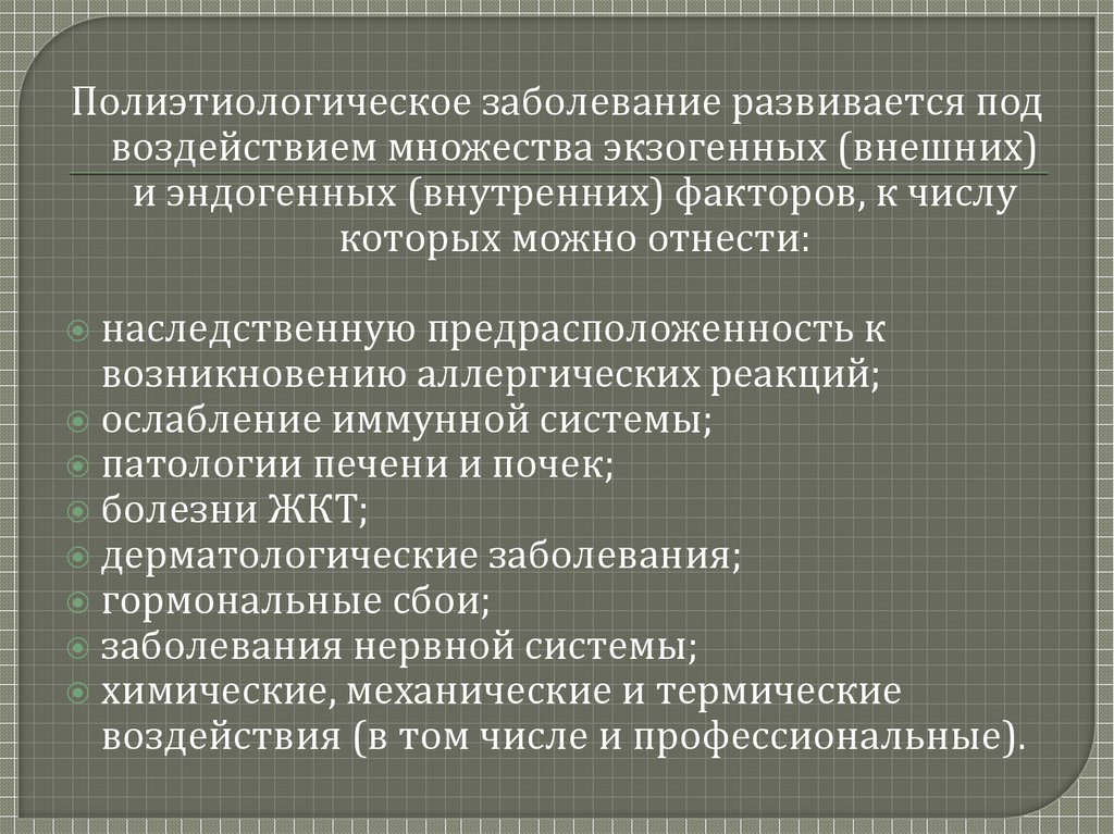 Полиэтиологическое заболевание развивается подвоздействием множества экзогенных (внешних)