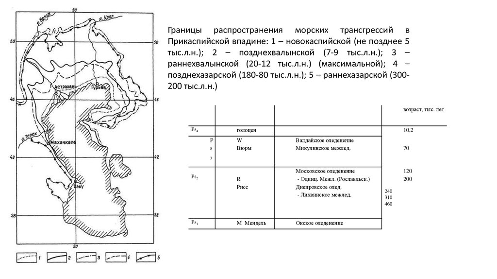 Границы распространения морских трансгрессий вПрикаспийской впадине: 1 – новокаспийской (не позднее 5