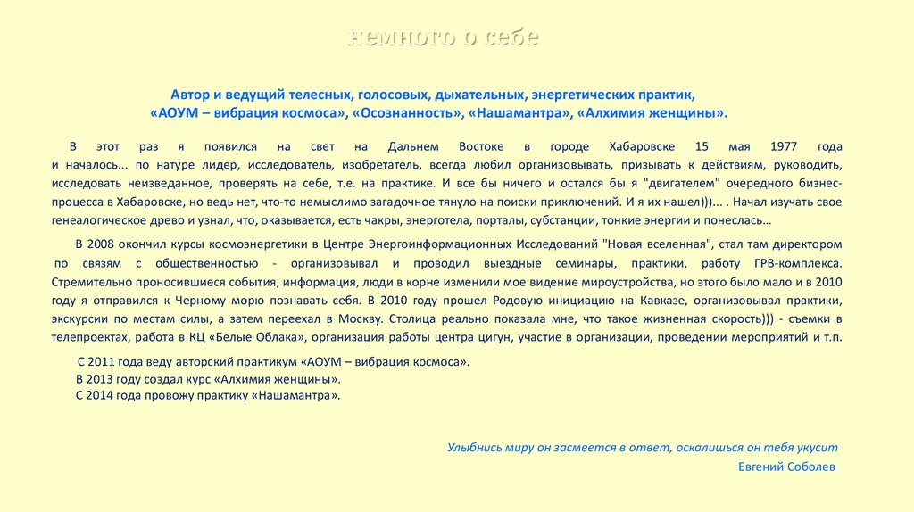немного о себеАвтор и ведущий телесных, голосовых, дыхательных, энергетических практик,