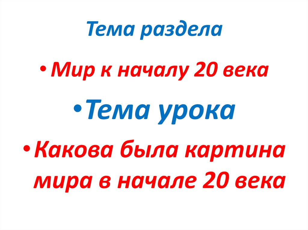 • Мир к началу 20 века•Тема урока