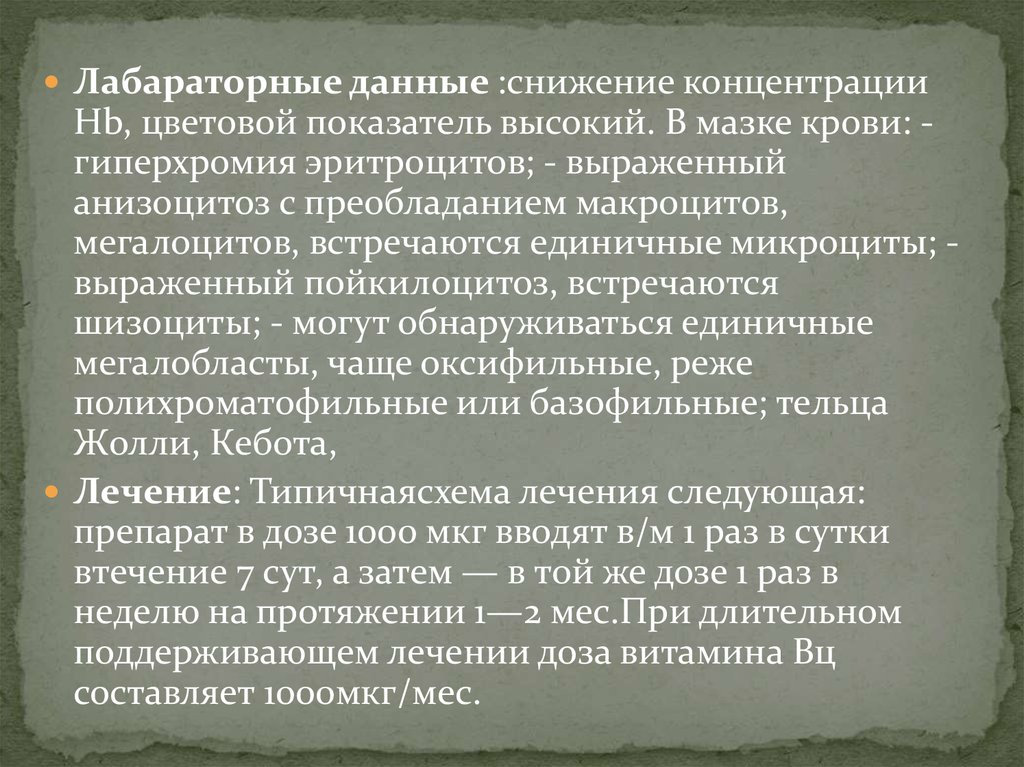 Лабараторные данные :снижение концентрацииHb, цветовой показатель высокий. В мазке крови: гиперхромия эритроцитов; - выраженный
