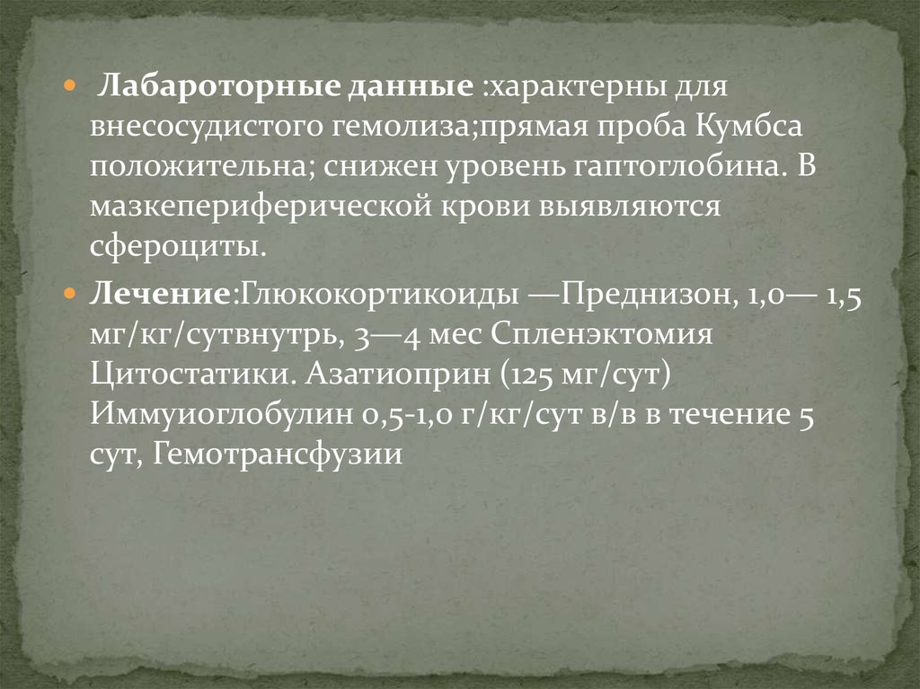 Лабароторные данные :характерны длявнесосудистого гемолиза;прямая проба Кумбса