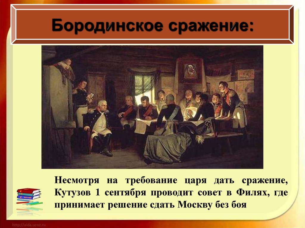 Несмотря на требование царя дать сражение,Кутузов 1 сентября проводит совет в Филях, где