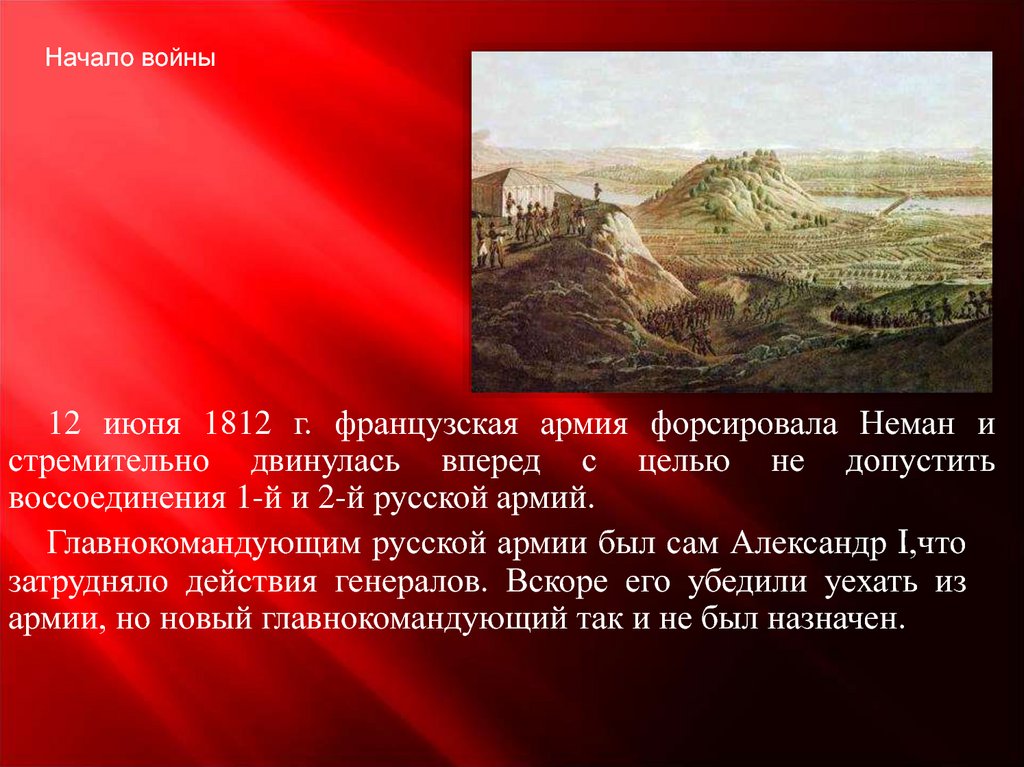 Начало войны12 июня 1812 г. французская армия форсировала Неман и