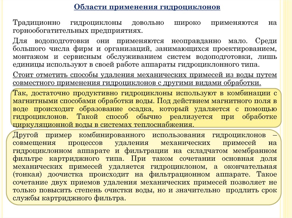 Области применения гидроциклоновГидроциклоны успешно применяются для решения задач: