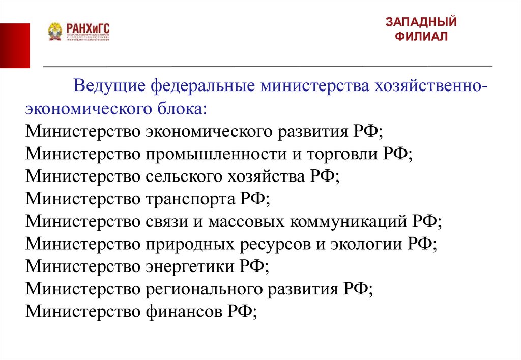 Ведущие федеральные министерства хозяйственноэкономического блока: