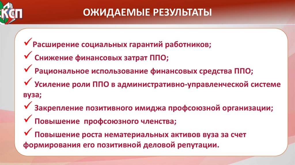 ОЖИДАЕМЫЕ РЕЗУЛЬТАТЫРасширение социальных гарантий работников;