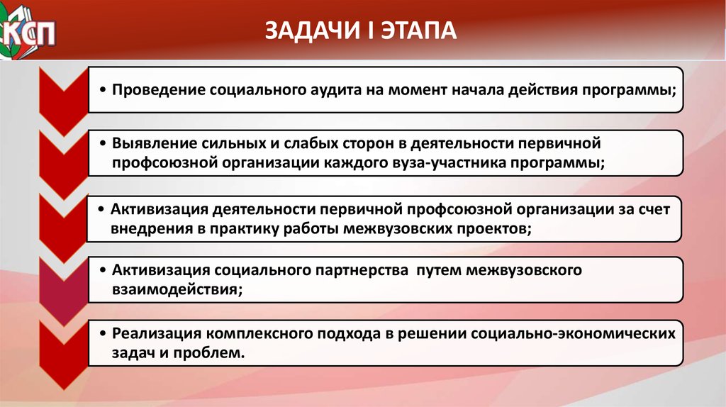 ЗАДАЧИ I ЭТАПА• Проведение социального аудита на момент начала действия программы;