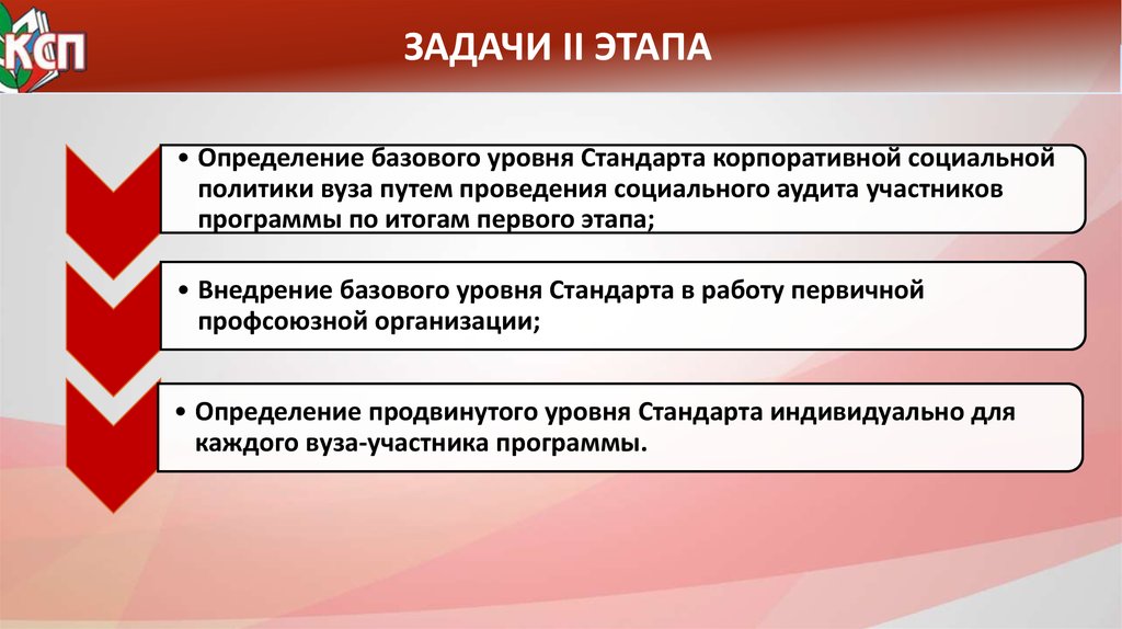 ЗАДАЧИ II ЭТАПА• Определение базового уровня Стандарта корпоративной социальной