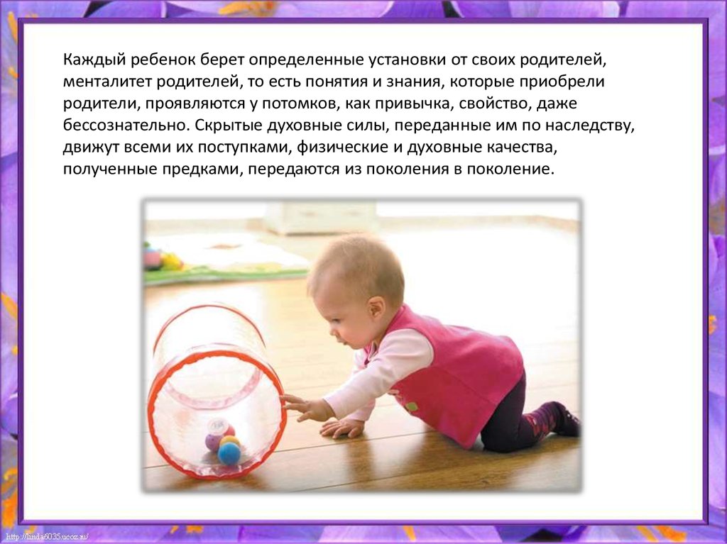 Каждый ребенок берет определенные установки от своих родителей,менталитет родителей, то есть понятия и знания, которые приобрели