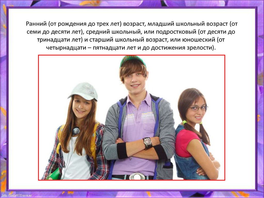 Ранний (от рождения до трех лет) возраст, младший школьный возраст (отсеми до десяти лет), средний школьный, или подростковый (от десяти до