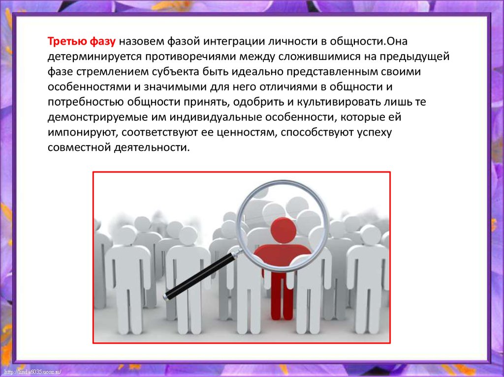 Третью фазу назовем фазой интеграции личности в общности.Онадетерминируется противоречиями между сложившимися на предыдущей