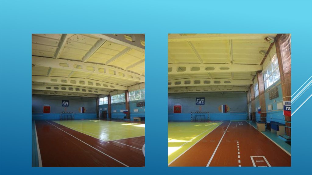 ПОСЛЕ РЕМОНТА ЗАЛ ВЫГЛЯДИТ ТАК7. Полностью побелен потолок, покрашены стены, заменены испорченные доски в полу, покрашен пол и нанесена новая разметка.
