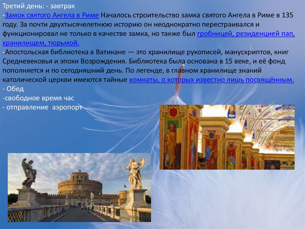 Третий день: - завтрак-Замок святого Ангела в Риме Началось строительство замка святого Ангела в Риме в 135