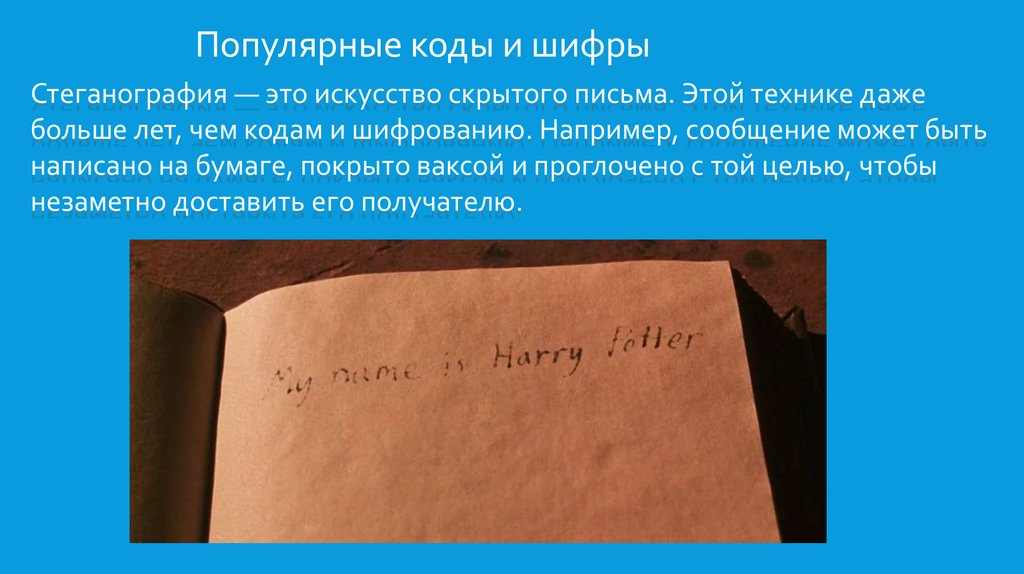 Популярные коды и шифрыСтеганография — это искусство скрытого письма. Этой технике даже