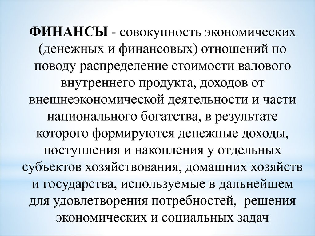 ФИНАНСЫ - совокупность экономических(денежных и финансовых) отношений по