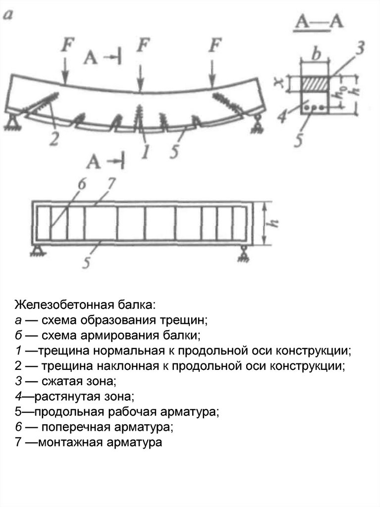 Железобетонная балка:а — схема образования трещин;