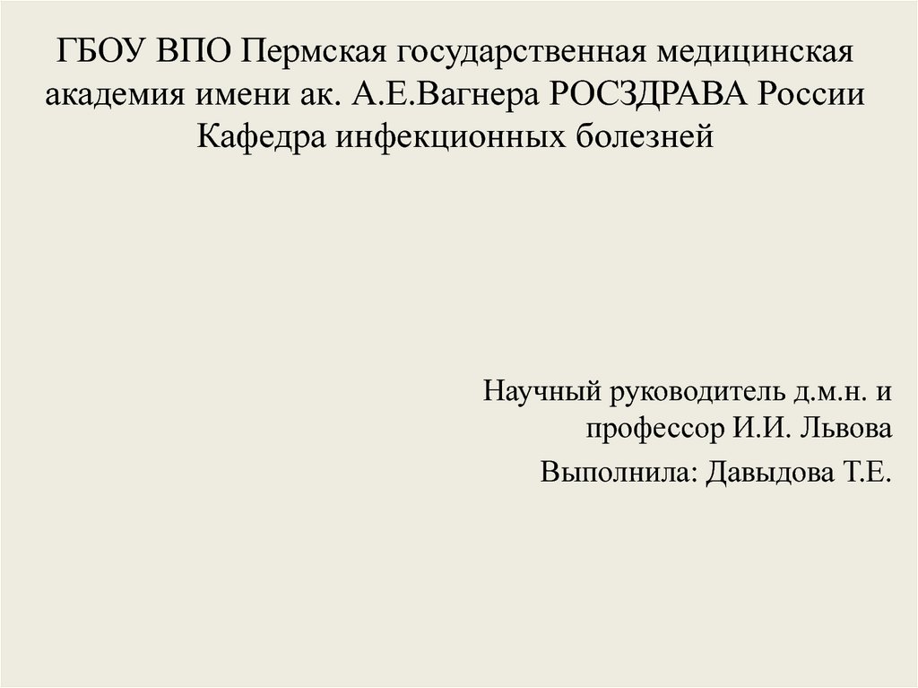1. ГБОУ ВПО Пермская государственная медицинская академия имени ак. А.Е.Вагнера РОСЗДРАВА России Кафедра инфекционных болезней