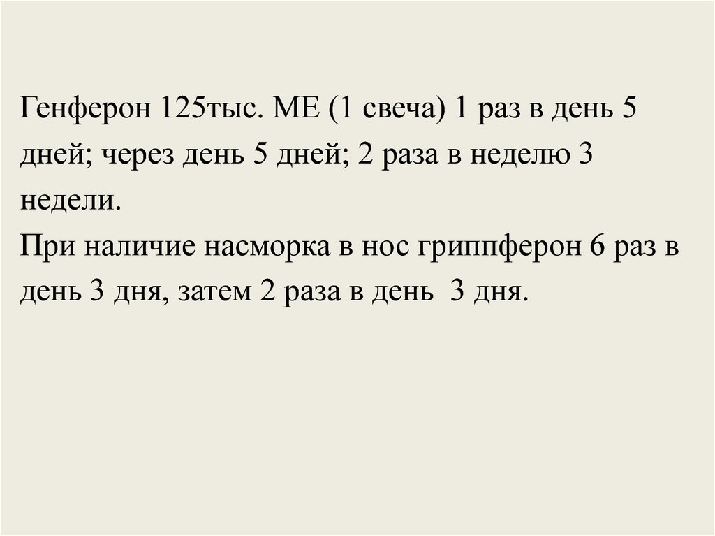 Генферон 125тыс. МЕ (1 свеча) 1 раз в день 5дней; через день 5 дней; 2 раза в неделю 3