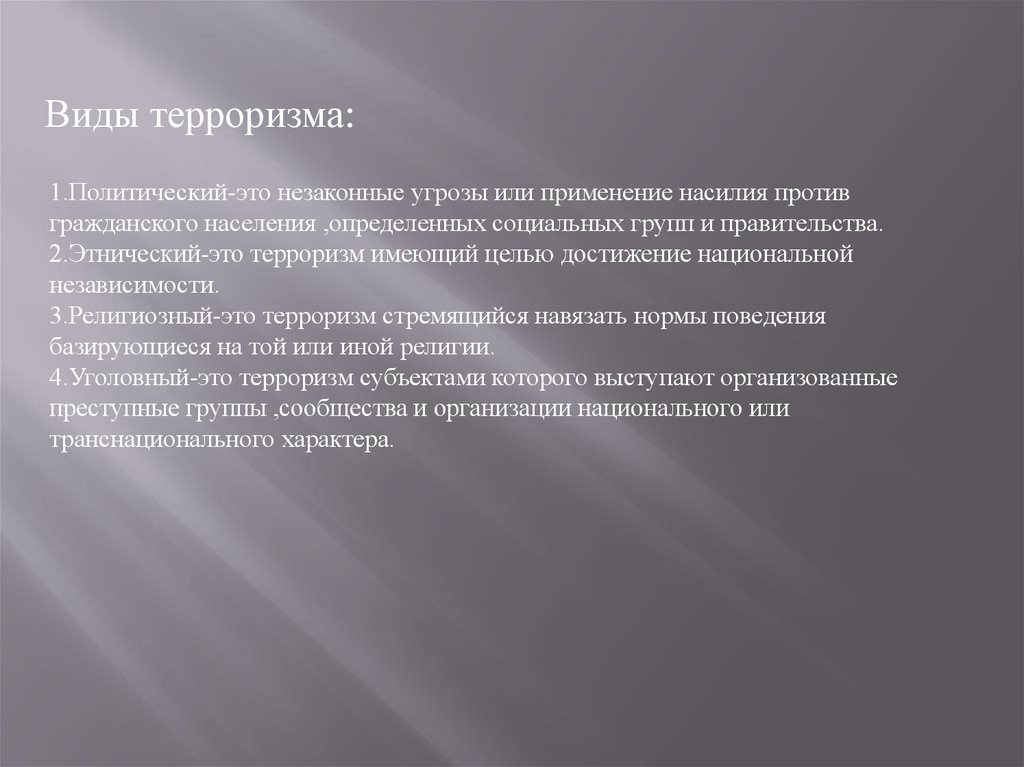 Виды терроризма:1.Политический-это незаконные угрозы или применение насилия против