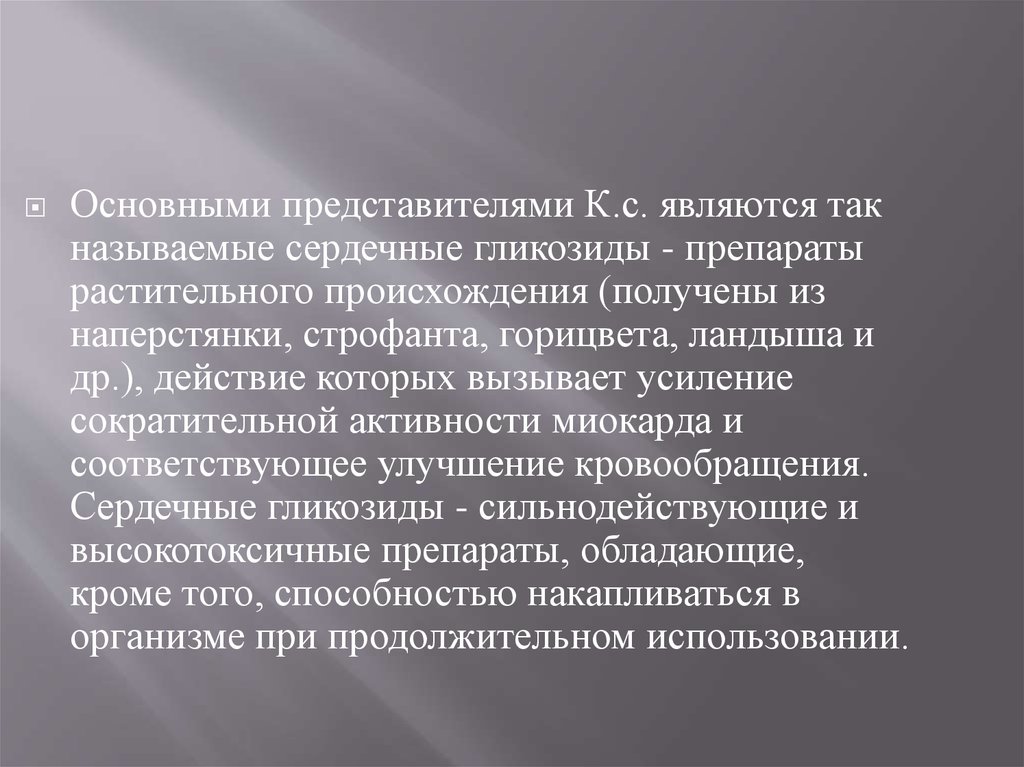 Основными представителями К.с. являются такназываемые сердечные гликозиды - препараты