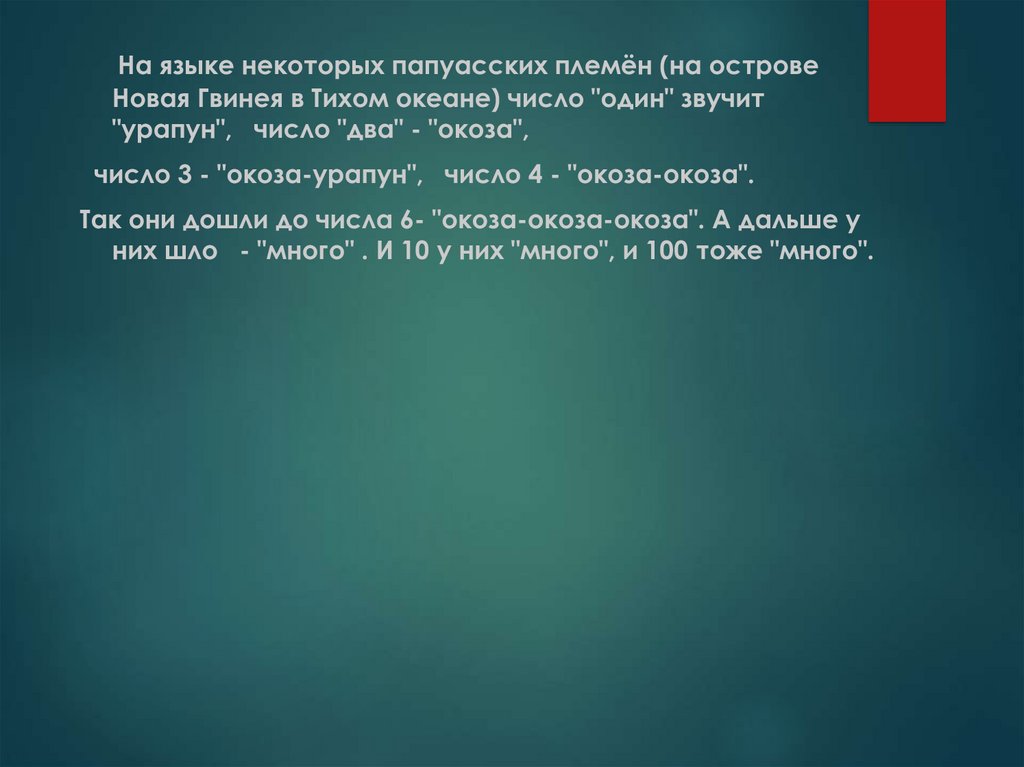 На языке некоторых папуасских племён (на островеНовая Гвинея в Тихом океане) число "один" звучит