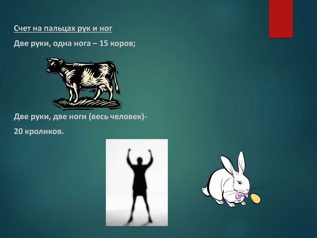 Счет на пальцах рук и ногДве руки, одна нога – 15 коров;