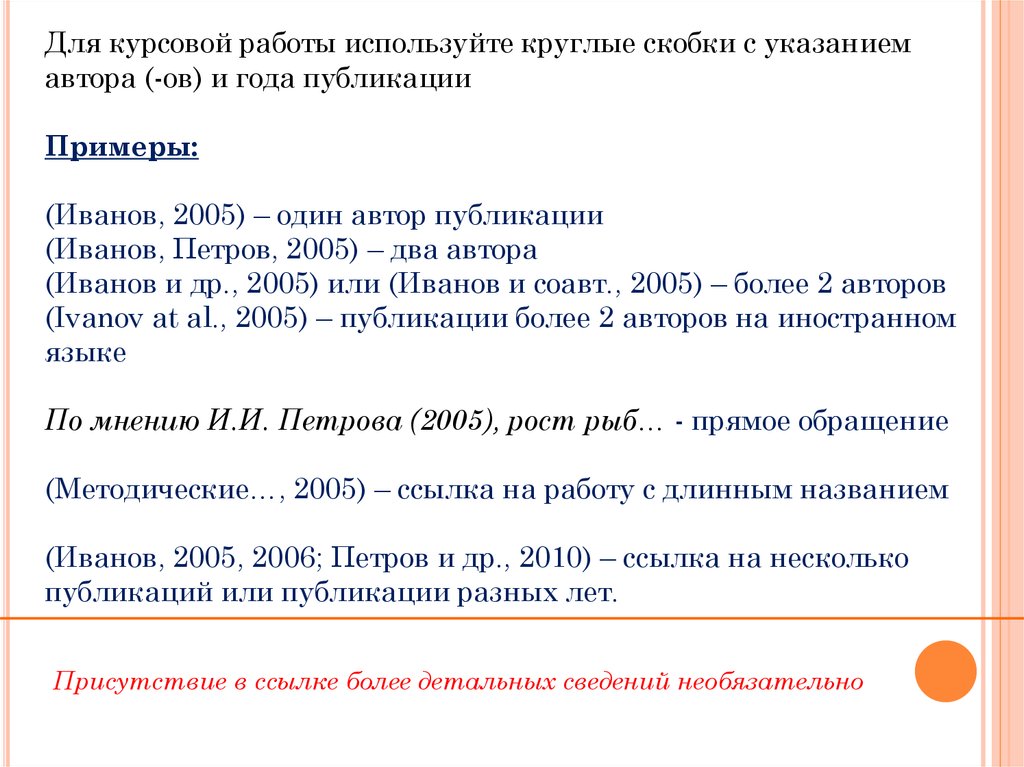 Для курсовой работы используйте круглые скобки с указаниемавтора (-ов) и года публикации