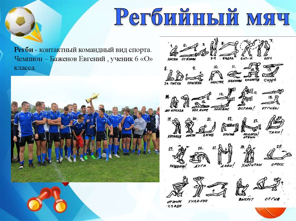 Регби - контактный командный вид спорта.Чемпион – Баженов Евгений , ученик 6 «О»