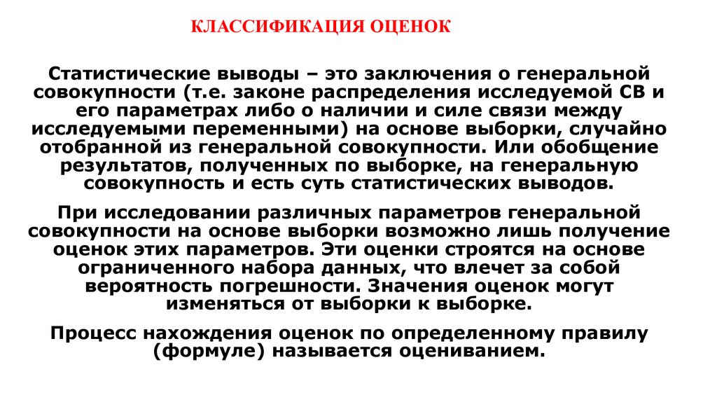 КЛАССИФИКАЦИЯ ОЦЕНОКСтатистические выводы – это заключения о генеральной