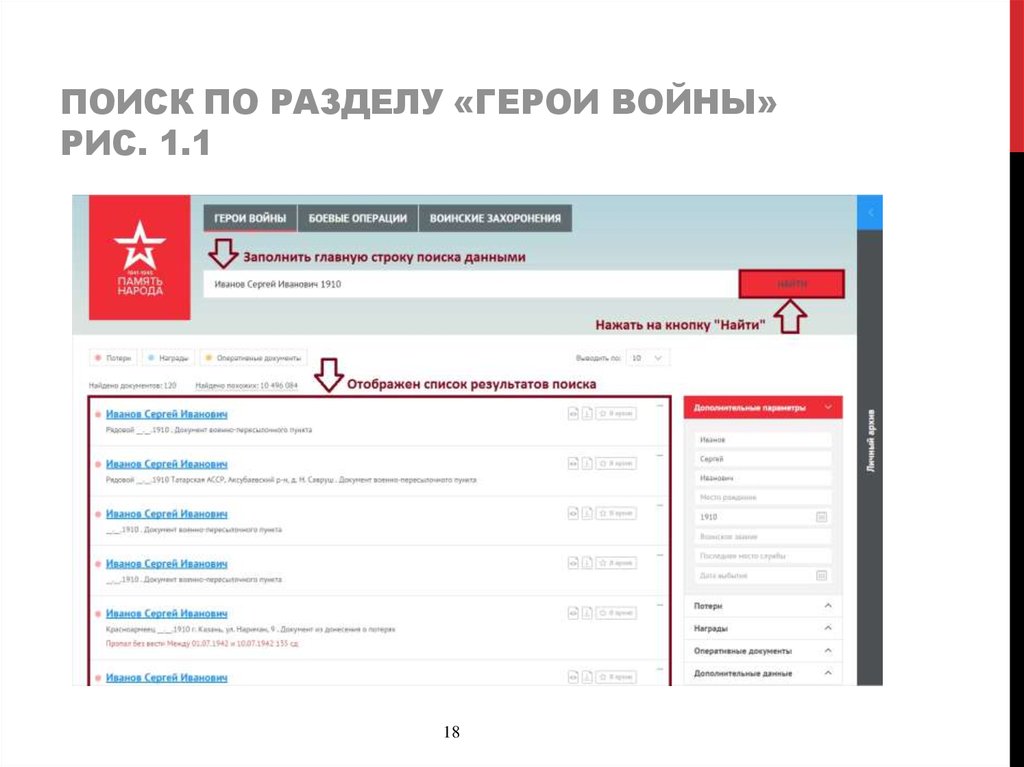 3. Работа с результатами поиска в разделе «герои войны» Рис. 1.3